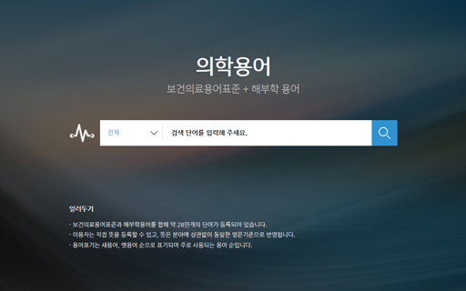 가장 최근 개정된 용어 중심으로 설계되어 있으며 영어, 신용어, 구용어 등을 검색할 수 있고, 발음도 들어 볼 수 있습니다.